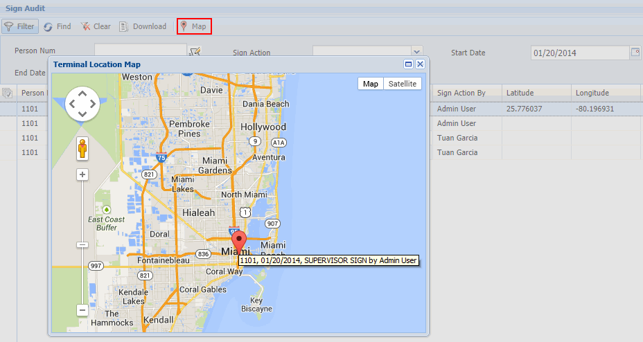To view the location of a sign action, select the record on the Sign Audit form and click the button at the top of the form. The Terminal Location Map pop-up form will display.