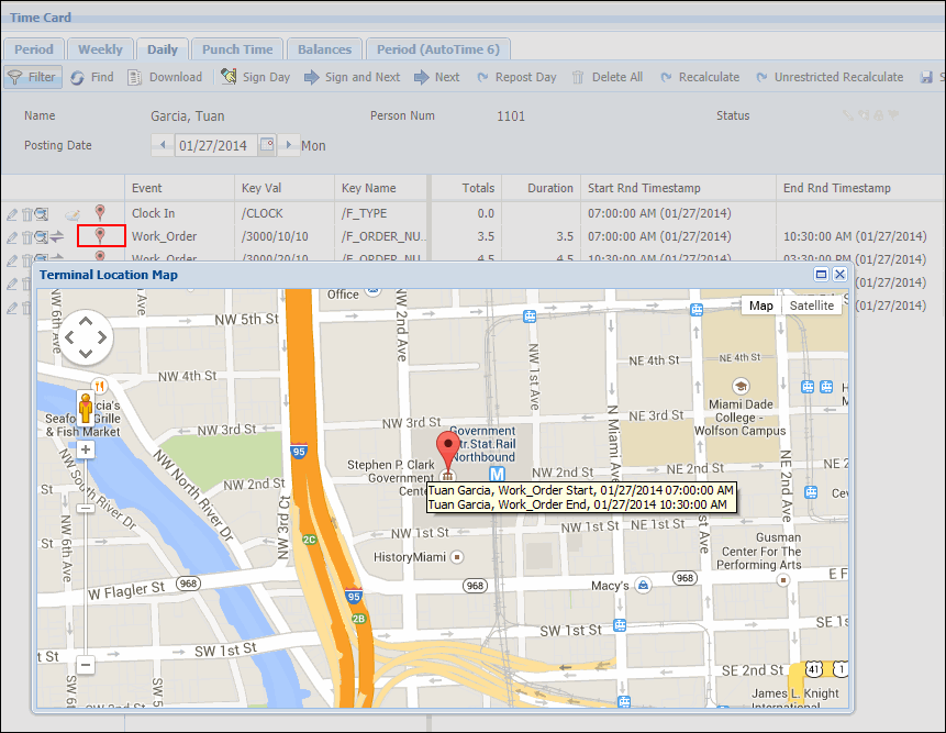 When you hover over the location, the date of the sign action will display along with the Person Number of the employee whose timecard was signed or unsigned and the person who signed it. You can use the map controls to zoom in or out.