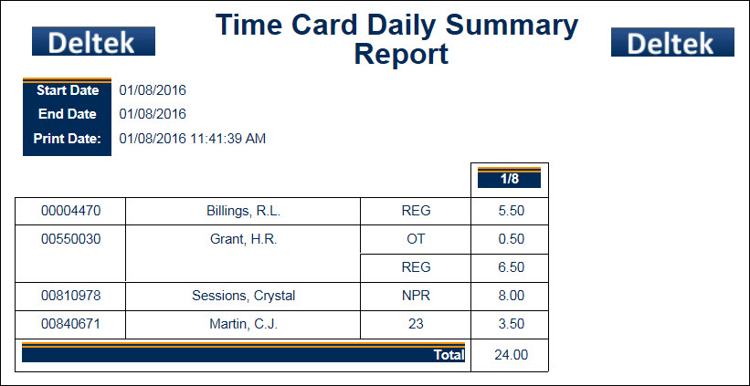 The Time Card Daily Summary Report lists hours that have posted on the timecard for each given day within a date range. Each day in the range will display any hours that posted along with the description of the hourly classification in the employee's Hours Class Group.