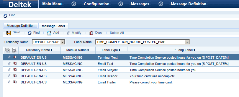 You can change the text of the message that will be sent to employees and supervisors when the TIME_COMPLETION service posts hours. To do so, use the Message Label tab of the Message Definition form.