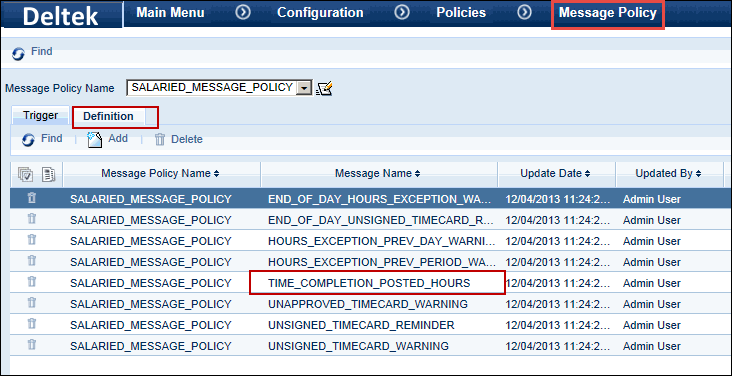 There are system-defined Message Rulesets, Message Definitions, and Message Policies that will generate messages to alert employees and their supervisors when the TIME_COMPLETION service has posted hours on the employee’s timecard. It is recommended that you copy the system-defined settings and policies and modify the duplicates as necessary.