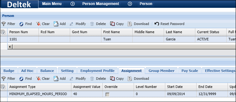 In the Assignment Value field, enter the minimum number of hours required for the person in a period or week. The TIME_COMPLETION service will compare the person’s posted hours with this minimum value to determine whether or not additional hours are needed to complete the timecard.