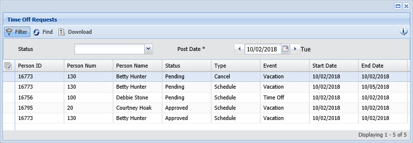 For time off requests, the Type will be Schedule if the request was to schedule the time off, or Cancel if the request was to cancel an approved time off request. The Status field will indicate whether the request has been Approved or is still Pending.
