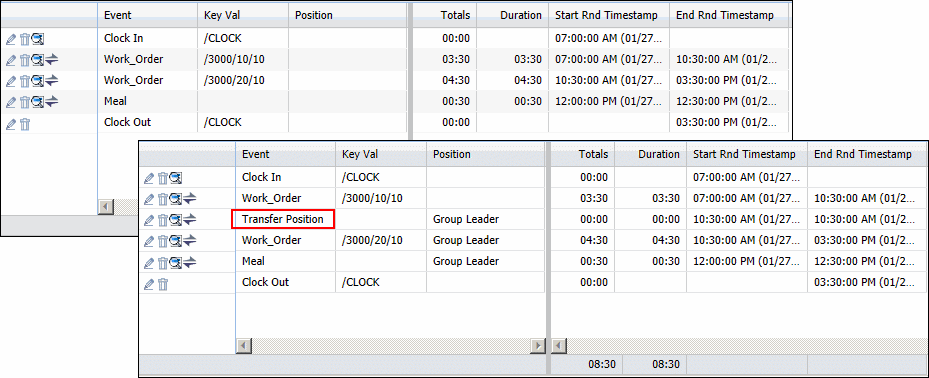 For example, a supervisor asks an employee to perform cleanup tasks for the remainder of a work day. The Job Code for these tasks is Scrub Crew and it has a Pay Rate of 25.00/hour. The employee performs these tasks as instructed. The next day, to make sure the employee is paid correctly, the supervisor will use Add Punch Pair to post the TRANSFER_JOB_CODE_IMMEDIATE event to the employee’s timecard and select the Scrub Crew Job Code. The timecard illustration below shows how the employee’s Job Code changed from Security Detail to Scrub Crew.