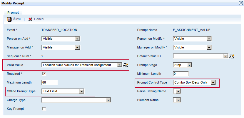 The default TRANSFER_LOCATION events include a Valid Value for the Department prompt (F_ASSIGNMENT_VALUE). Make sure the event's Prompt Control Type is set to Combo Box Desc Only when this Valid Value is defined. You should also set the Offline Prompt Type to Text Field to allow users to scan/enter the Department number on an offline terminal.
