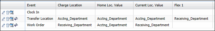 In the illustration below, the employee transferred from their home location (Accounting) to the Receiving department. The new location (Receiving) displays for the (Work Order) event that follows. In addition, the Flex 1 column has been configured to display the new location for the TRANSFER_LOCATION event.