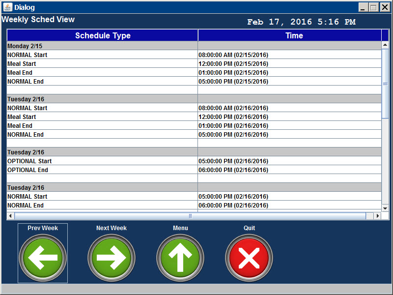 The Weekly Schedule View option in the terminals and Web Time Clock will allow an employee to view his or her schedule for a specific pay week. The pay week is based on the person’s Pay Policy.