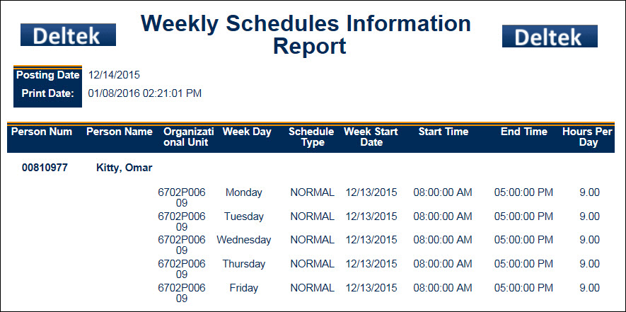 The Weekly Schedules Information Report displays active employees' schedules per week. The report considers Sunday to be the first day of a week. One week spans from Sunday through Saturday. You specify a posting date as the starting point for which weeks to consider. You can run the report for one employee, all active employees, or specific groups of employees. The report displays the amount of hours each employee is supposed to complete for each considered week. It also shows schedule information for the specified amount of weeks in the future.