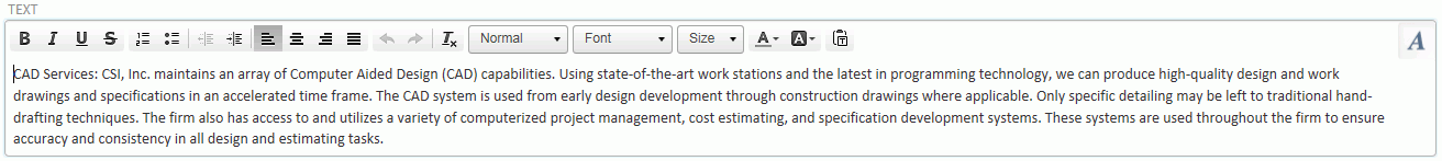 You can create boilerplates to describe opportunities, projects, firms, contacts, and campaigns. Keep in mind that boilerplates are written and formatted for use in published content, such as proposals, [are there others?]. Use the Text field's formatting toolbar to apply appropriate text formats that match those used in proposals.