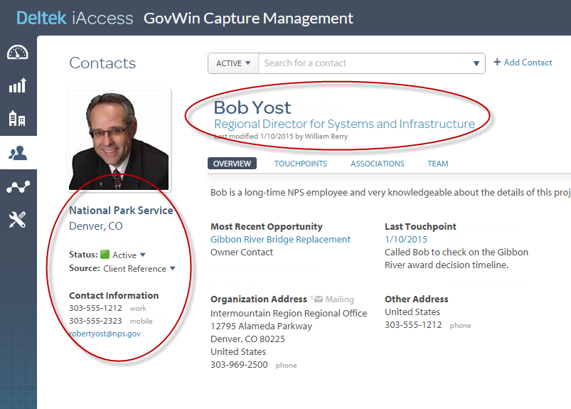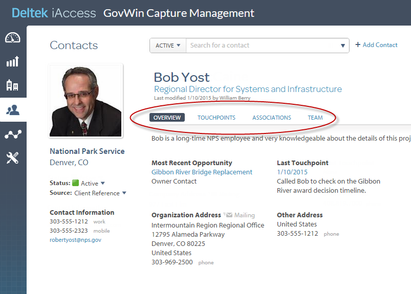 company and location, phone numbers, and email address, is always visible. Other information displays on the Overview, Touchpoints, Associations, and Team tabs. (Your system administrator may also add custom tabs to supplement these standard tabs.)