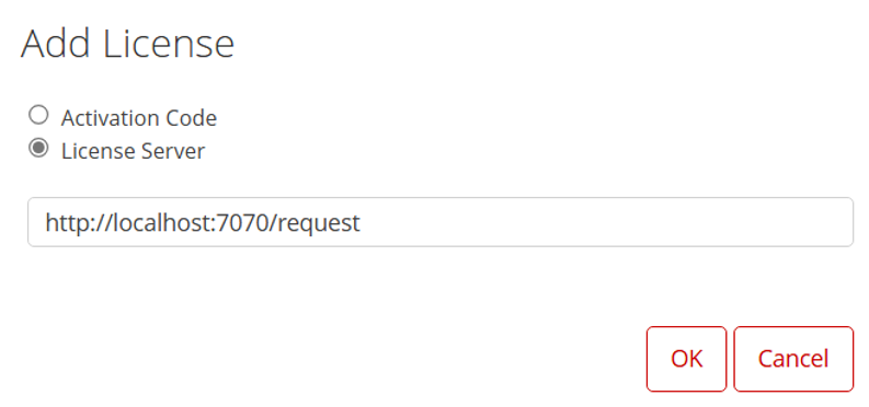 - Select License Server, enter either the cloud license server URL (provided by your company) or the local license server URL (http://<license_server_host>:7070/request), and click OK.