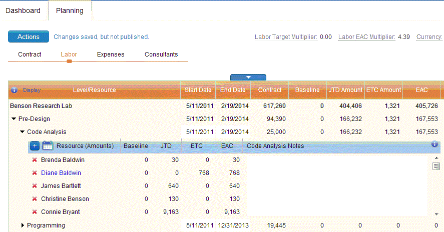 Resource Grids The Navigator Planning grids include Resource grids that allow you to enter information for the assigned WBS levels for the current project. The Resource grids are dynamic based on the Project Management area in which you are working. For example, the Consultant Resource grid allows you to enter consultant-related data, while the Labor Resource grid allows you to enter labor resources. The lookup options and project information that are available for these grids are also dynamic based on area.