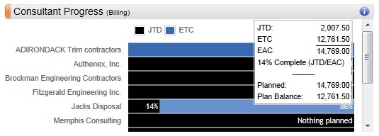 You can also hover over each consultant's progress bar to view a summary of the amounts. For example, when you hover over Jacks Disposal, the respective JTD, ETC, EAC, and planned amounts and calculations display.