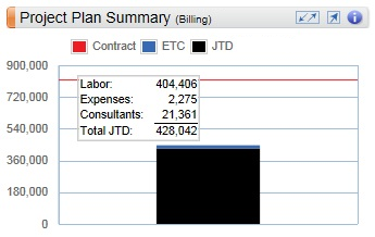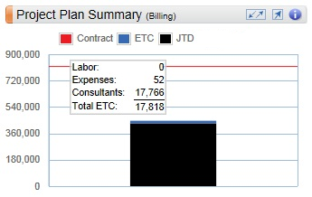 The following example shows the Project Plan Summary chart at Billing. As indicated on the legend, when viewing billing amounts the JTD, ETC, and Contract are color coded so that you can easily compare their amounts at a glance. The JTD and ETC are shown together on a bar, which allows you to summarize how they are trending simply by the colors that represent the amounts. In addition, the contract displays as a separate horizontal line across the chart, which provides a contrasting visual so you can quickly see how close the JTD and ETC are to the contract. It can even show these amounts as higher than the contract, which indicates a project that is currently over budget and requires review.