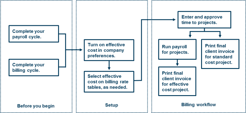 After completing a payroll and billing cycle, turn on effective cost in company preferences, which makes effective cost options available in billing rate tables, employee setups, and client invoices.