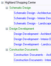 The detail area on the lower half of the Project Command Center contains an area where you build the work breakdown structure for your project in a tree-type hierarchy. Here are some examples of the way you may want to build the work breakdown structure for a project and the way it looks in the project tree in the Project Command Center: