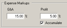 Each field contains a markup percent for applying that particular markup to all cost rates or amounts. Enter it as a percent, such as 40 for 40%. Enter a zero amount if you do not want to apply a markup.