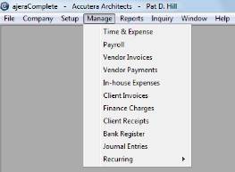 After you set up Ajera and go live, you perform much of your typical day-to-day work by opening options from the > Manage menu.