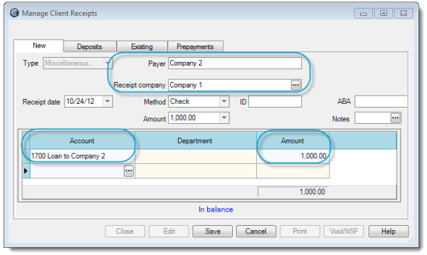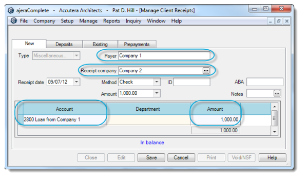 • In > Manage > Client Receipts, enter a miscellaneous receipt with Company 1 as the payer, Company 2 as the receipt company, Loan from Company 1 as the account, and 1000 as the amount.