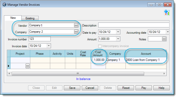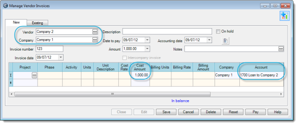 • In the > Manage > Vendor Invoices window, create a vendor invoice with Company 2 as the vendor, Company 1 as the company, 1000 as the cost amount, and Loan to Company 2 as the account.