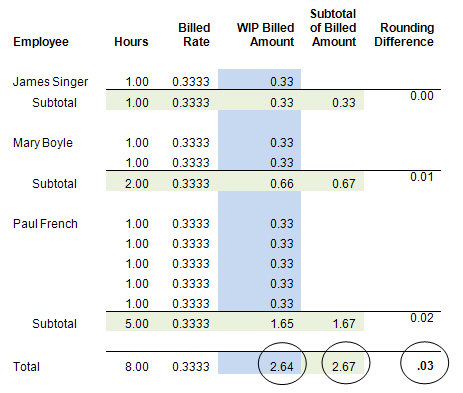 Rounding discrepancies can occur on client invoices that bill time and expenses because it is possible for the sum of each individual work-in-progress (WIP) transaction to be different from the calculated subtotal of those transactions.