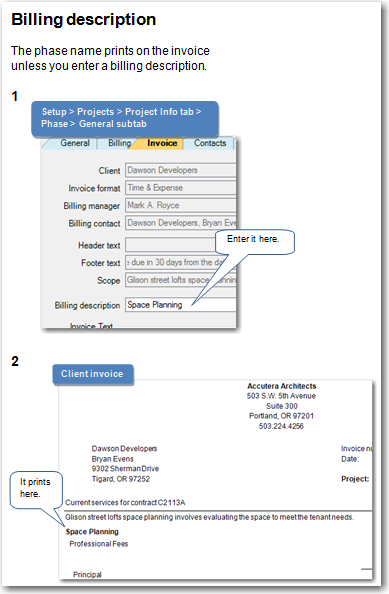 It automatically contains the name of the phase unless you change it. In the Print Project box on the Invoice Summary, Fee Type, and Time & Expense tabs of the Invoice Format window, you can choose to print the billing description in bold or uppercase, and to include the phase ID.