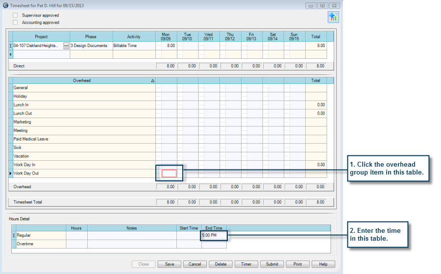 1. In the Hours Detail table, type the time in the End Time cell and press the Tab key. In the Overhead table, 0 appears in the Total column. Example: