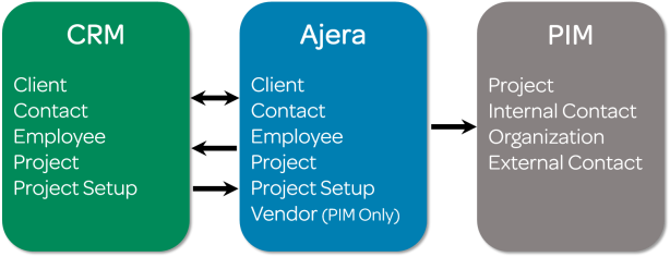 If you integrate with PIM, client, contact, employee, vendor, and project records in Ajera are automatically recreated and updated in PIM. If you are also syncing with CRM, records created and updated in Ajera during the sync are also automatically created and updated in PIM.