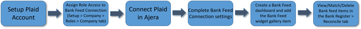 Before enabling the bank feed in Ajera, you must assign role access and establish the bank feed connection. When you select Company > Bank Feed Connection, you are then asked to enter your Ajera support credentials to activate Plaid. Once connected, you then set up the account.