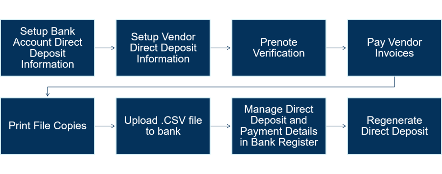 With vendor direct deposits, you can create a NACHA compliant file that can be uploaded to your bank for automated payment processing. The vendor direct deposit payment option also includes the option to print file copies. Once you set up the bank account and vendors for direct deposit, you can start using direct deposit to pay vendor invoices. You also have the option to use a prenotification (prenote) to ensure the format of the direct deposit file is correct before making an actual direct deposit. If something happens to the direct deposit file, you can regenerate it in the bank register.