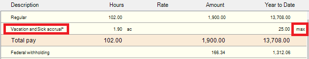 When an employee has reached their accrual cap, max will be displayed next to the accrual total in the Year to Date column in the Edit Paycheck window.