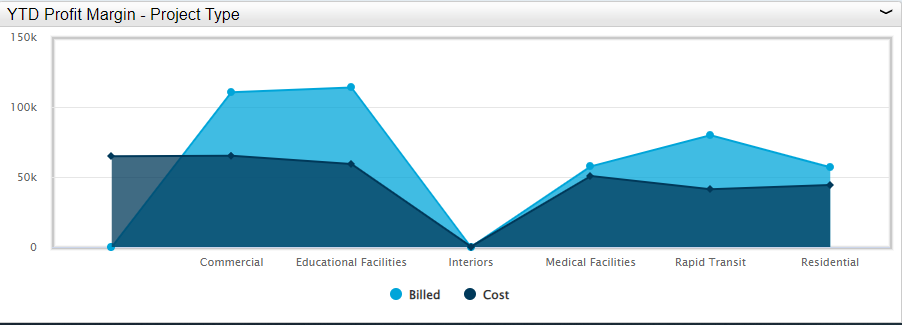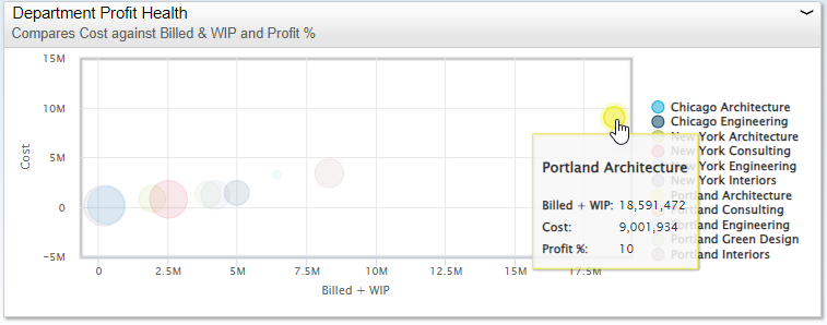 It makes it easy to see which departments have the highest Revenue and Cost, as well as identifying which ones have the highest profit percent. In this example, you can see that Portland Architecture has the highest Revenue & Cost and a smaller profit percent. While projects with smaller Revenue & Cost have larger profit percent. |