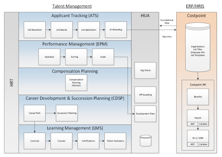 In Costpoint, you can perform integration through the Transfer Talent Management Data application. You can run the process on demand or scheduled through process server. It handles both export of data to Talent Management, initial load and synchronization, and import of new hires into Costpoint from Talent Management. The diagram below provides a visualization of the interface.
