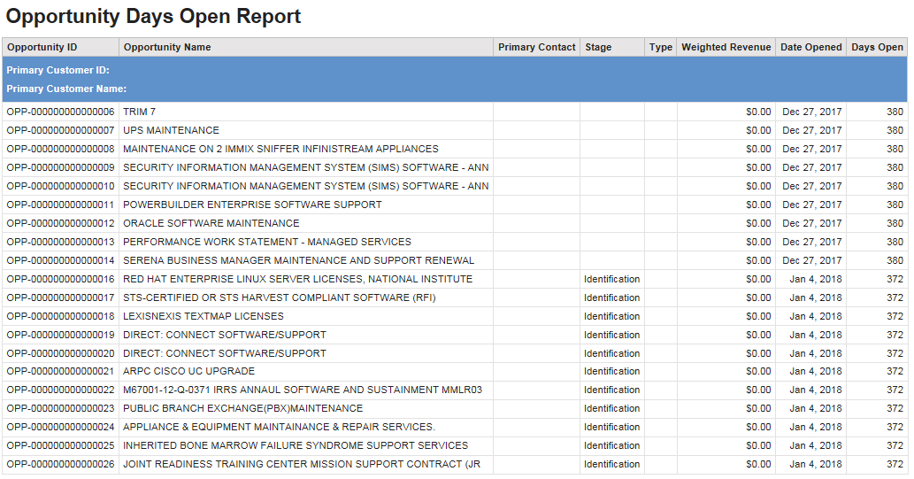 Sample Report This is a sample Opportunity Days Open report. Parent Topic: Opportunity Days Open Report HomeReports & AnalyticsWelcome to Costpoint Business IntelligenceCRM & ContractsCRM & Contracts ReportsOpportunity Days Open ReportSample Report