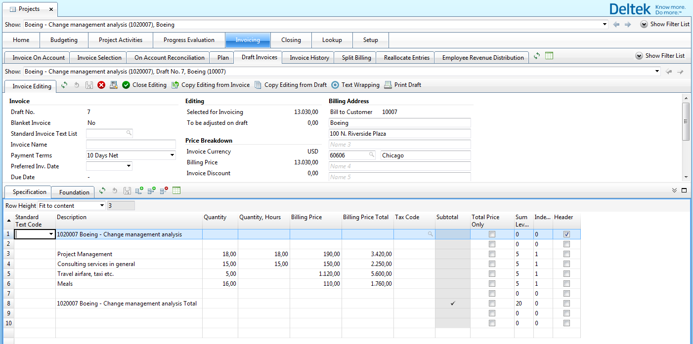 After you select the entries for invoicing, a draft is created where you can edit the layout of the invoice and include additional information on the invoice, as long as total invoice figures remain the same. When you are finished, click the Close Editing button. Finance is notified via a To-Do and can subsequently print the invoices.