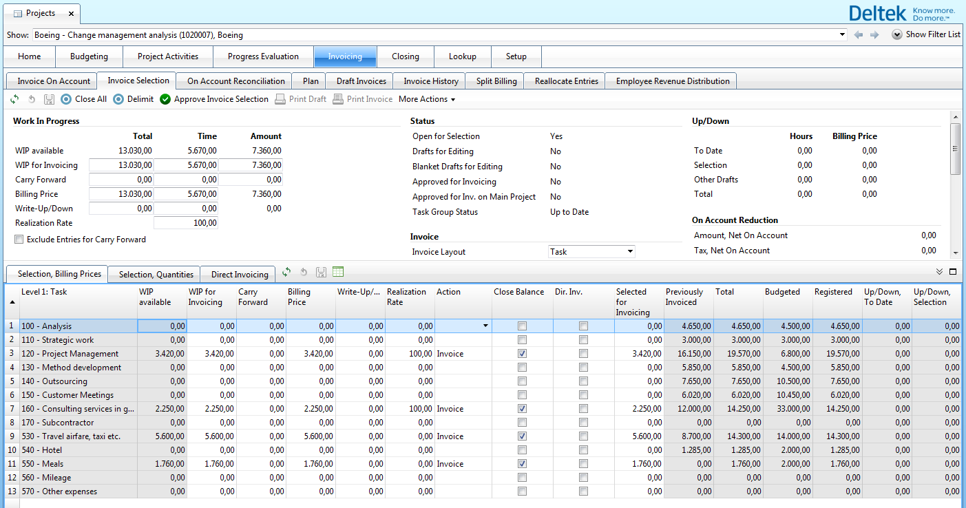After selecting a project, you go to the following window, which shows all entries that are ready for invoicing.