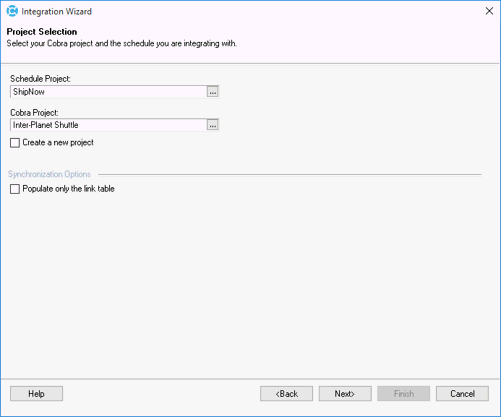 5. On the Project Selection page, PM Compass overrides the Schedule Project and Cobra Project fields based on the project selected in the change request. You need to select a project that uses the same field mappings with the schedule as the one you intend to select in the change request. All projects with the same field configuration and schedule mapping can use a single change request type; however, if you have some projects with different configurations (for example, some have three key fields and some have two key fields), you will need to create separate integration files and change request types for each project configuration and schedule mapping.