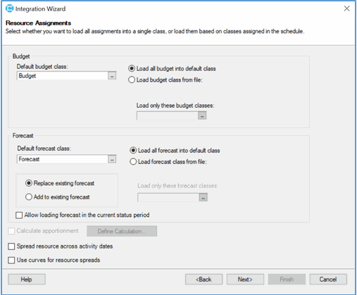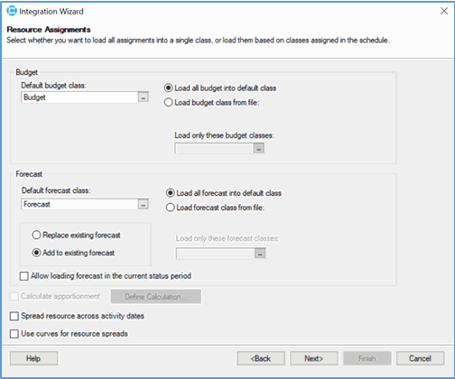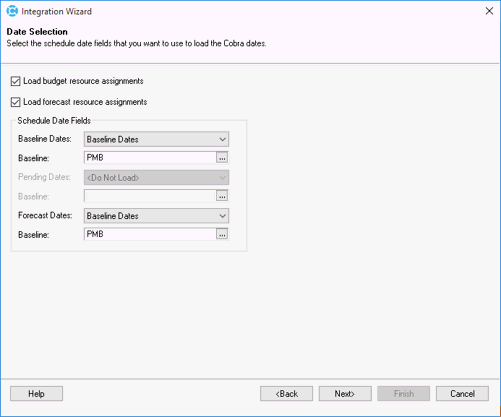 6. The settings on the Date Selection page are overridden to match what is defined in Workflow Type Configuration. You should select to load both budget and forecast as well as Baseline Dates so that the remainder of the Integration Wizard pages allow you to select the proper fields.