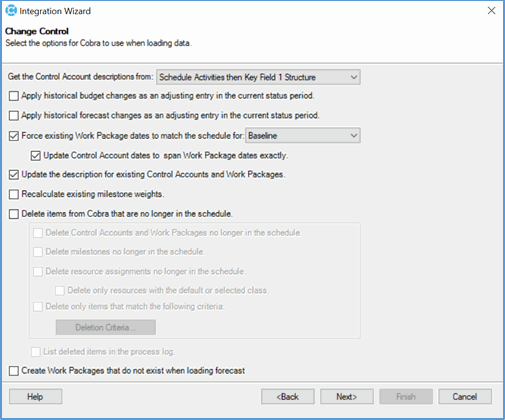 Part of the change request process is using Cobra's Integration Wizard, called through the API and web services, to load data from the Open Plan schedule into Cobra. Some of the settings are defined in the wizard and some are overwritten based on options you select on the Change Details on Form tab in Workflow Type Configuration. This allows you to configure options such as how your project is linked to the schedule as well as your change control options. These configurations are set in Workflow Type Configuration for each change request type.