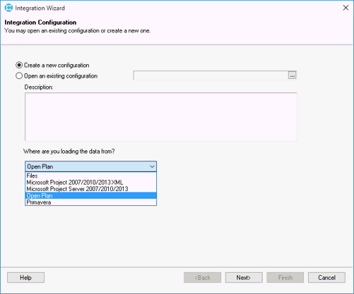 3. On the Integration Configuration page, in the Where are you loading the data from? drop-down list, select the product to which you are integrating (Open Plan, Microsoft Project, or Microsoft Project Server.