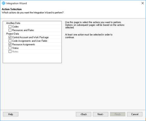 4. On the Action Selection page, under the Project Data heading, select: